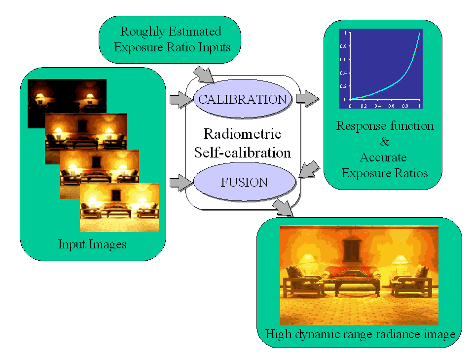 To achieve the above goals, we have developed a radiometric self-calibration algorithm. The algorithm computes the response function of the imaging system from a plurality of images of an arbitrary scene taken using different exposures. Since, in any imaging system it is difficult to obtain precise values for the exposures (for instance, the aperture setting on a lens only gives an approximate exposure value), we have developed an algorithm that takes rough exposure estimates and the corresponding images to compute the response function of the system, the precise exposure values and a single high dynamic range radiance image of the scene. The basic flow of data in our algorithm is illustrated below. Details of the algorithm are described in our CVPR99 paper.